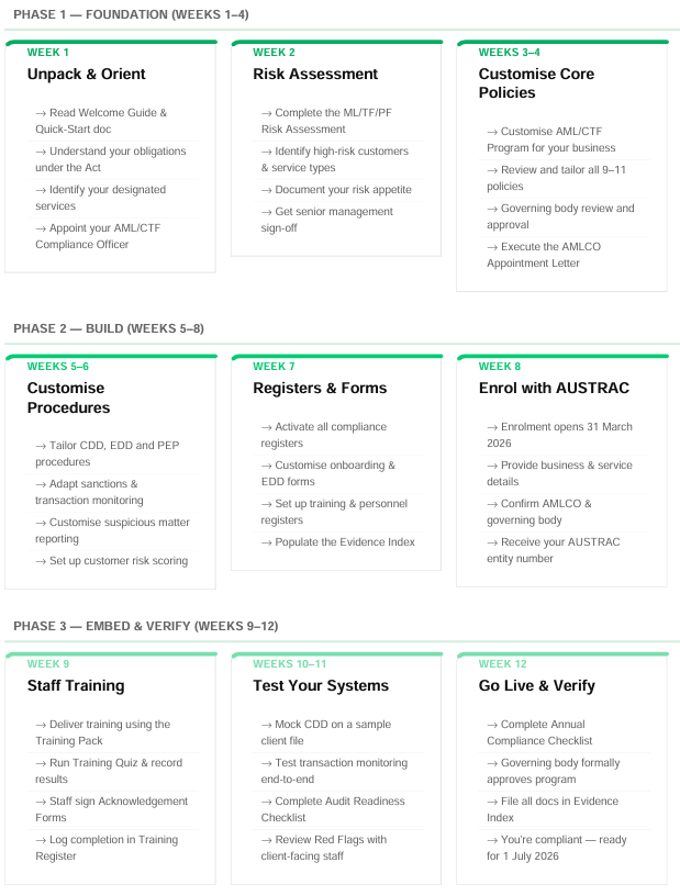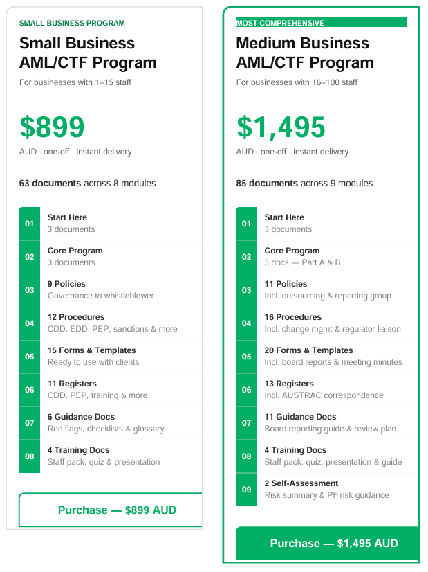Two complete programs built for AUSTRAC's Tranche 2 reforms. Choose based on your team size.